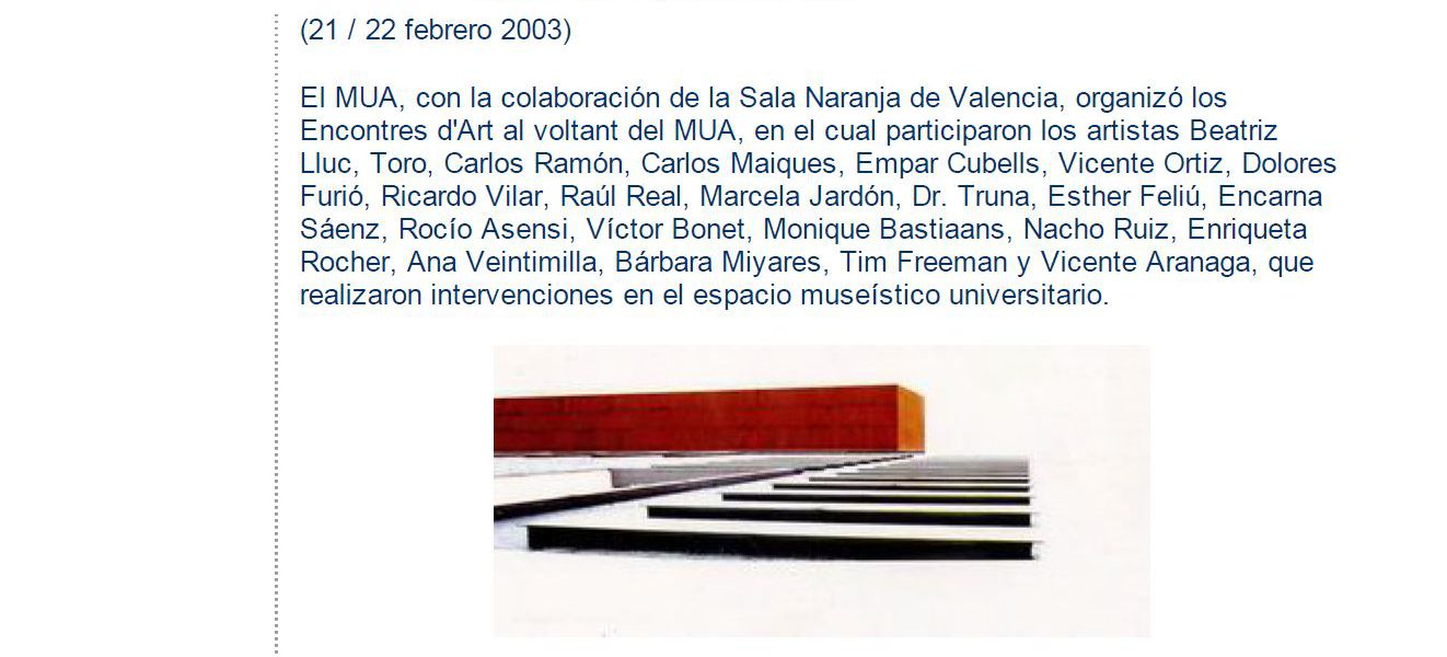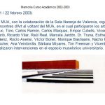 Documentación Exposiciones(2002) Encontres al voltant del MUA, Alicante por marcela30/10/202320/02/2024 Videoproyecciones sobre los muros. encontres_al_voltant_del_MUAMemoriaCursoAcademico2002-2003completoVisitas: 1