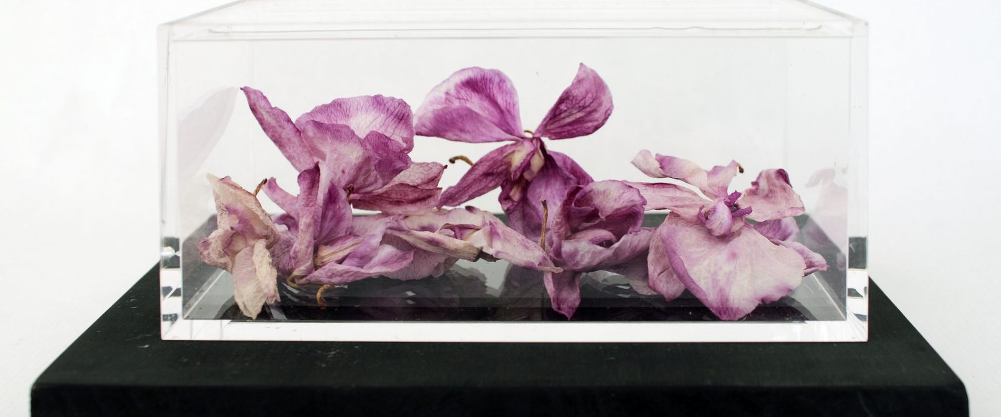 Caja de metacrilato, orquídeas cultivadas y secadas, escritura.